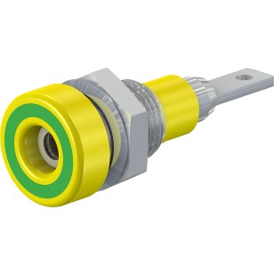 Insulated, Ø 2 mm with spring-loaded MULTILAM. Machined brass. Metal thread jacket on the insulation. The socket can be screw-mounted in predrilled panels.Flat connecting tab 2.8 mm x 0.8 mm.