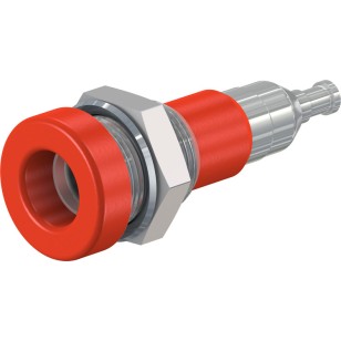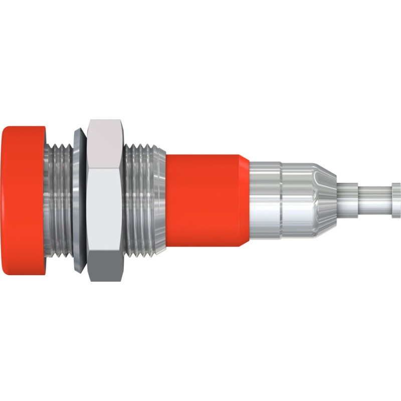 Insulated, Ø 4 mm, rigid. Machined brass. Metal thread jacket on the insulation. The socket can be screw-mounted in predrilled panels. Available with hexagonal nut.Solder connection.