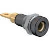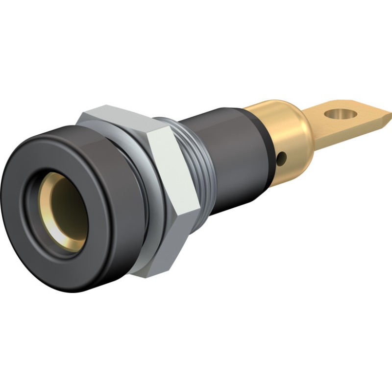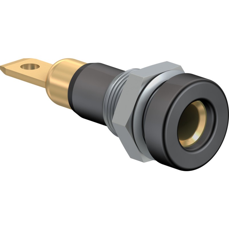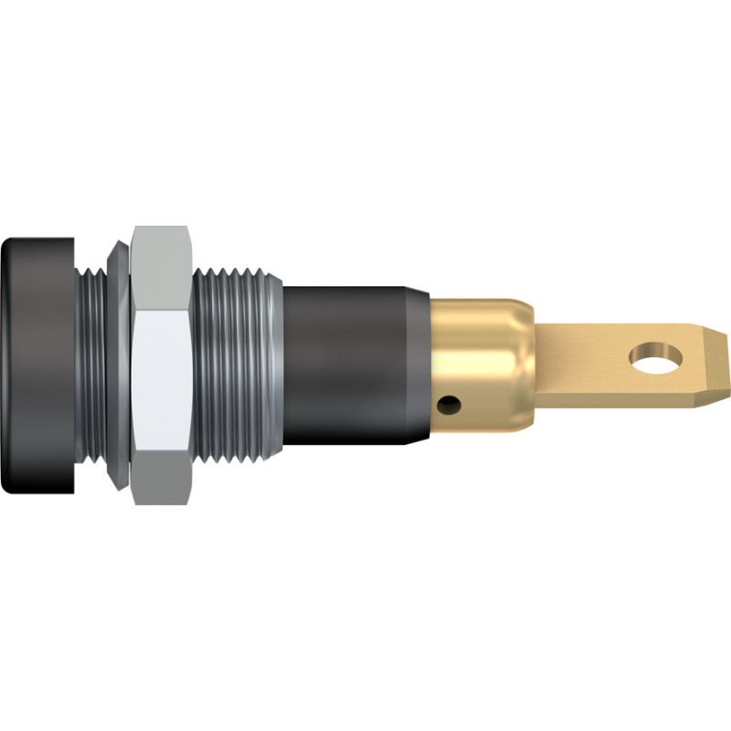 Insulated, Ø 4 mm, rigid. Machined brass. Metal thread jacket on the insulation. The socket can be screw-mounted in predrilled panels. Available with hexagonal nut.Flat connecting tab 4.8 mm x 0.8 mm.