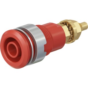 Insulated, rigid, Ø 4 mm, accepting spring-loaded Ø 4 mm plugs with rigid insulating sleeve. Machined brass. The socket is screwed into pre-drilled panels of plastic, metal, etc.Connection: Threaded bolt M4 and soldering hole.