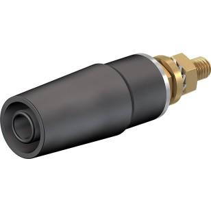 Insulated, rigid, Ø 4 mm, accepting spring-loaded Ø 4 mm plugs with rigid insulating sleeve. Machined brass. The socket is surface-mounted in pre-drilled panels of plastic, metal, etc.Connection: Threaded bolt M4.