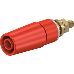 Insulated, rigid, Ø 4 mm, accepting spring-loaded Ø 4 mm plugs with rigid insulating sleeve. Machined brass. The socket is surface-mounted in pre-drilled panels of plastic, metal, etc.Connection: Threaded bolt M4.