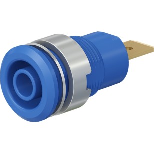 Insulated, rigid, Ø 4 mm, accepting spring-loaded Ø 4 mm plugs with rigid insulating sleeve. Machined brass. The socket is screwed into pre-drilled panels of plastic, metal, etc.Connection: Flat connecting tab 6,3 mm × 0,8 mm.