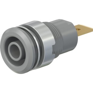 Insulated, rigid, Ø 4 mm, accepting spring-loaded Ø 4 mm plugs with rigid insulating sleeve. Machined brass. The socket is screwed into pre-drilled panels of plastic, metal, etc.Connection: Flat connecting tab 6,3 mm × 0,8 mm.