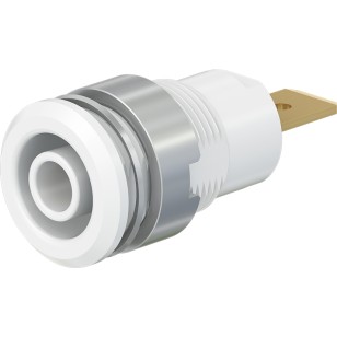 Insulated, rigid, Ø 4 mm, accepting spring-loaded Ø 4 mm plugs with rigid insulating sleeve. Machined brass. The socket is screwed into pre-drilled panels of plastic, metal, etc.Connection: Flat connecting tab 6,3 mm × 0,8 mm.