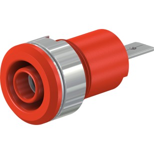 Insulated Ø 4 mm rigid sockets accepting spring-loaded Ø 4 mm plugs with rigid insulating sleeve. Brass sheet, nickel-plated. The socket is screwed into predrilled panels of plastic, metal etc.Flat connecting tab 4.8 mm × 0.8 mm, can be bent to 90°, once only.