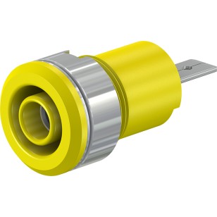 Insulated Ø 4 mm rigid sockets accepting spring-loaded Ø 4 mm plugs with rigid insulating sleeve. Brass sheet, nickel-plated. The socket is screwed into predrilled panels of plastic, metal etc.Flat connecting tab 4.8 mm × 0.8 mm, can be bent to 90°, once only.