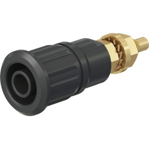 Insulated, rigid, Ø 4 mm, accepting spring-loaded Ø 4 mm plugs with rigid insulating sleeve. Machined brass. The socket is pressed into pre-drilled panels of plastic, metal, etc.Connection: Threaded bolt M4 and soldering hole