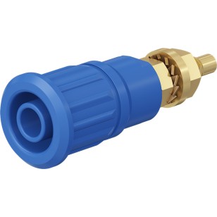 Insulated, rigid, Ø 4 mm, accepting spring-loaded Ø 4 mm plugs with rigid insulating sleeve. Machined brass. The socket is pressed into pre-drilled panels of plastic, metal, etc.Connection: Threaded bolt M4 and soldering hole