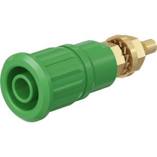 Insulated, rigid, Ø 4 mm, accepting spring-loaded Ø 4 mm plugs with rigid insulating sleeve. Machined brass. The socket is pressed into pre-drilled panels of plastic, metal, etc.Connection: Threaded bolt M4 and soldering hole