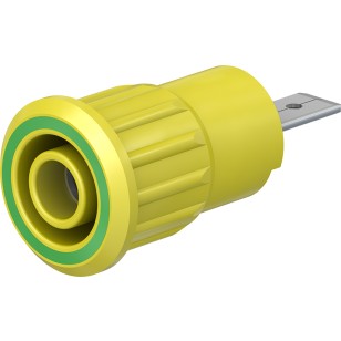 Insulated, rigid, Ø 4 mm, accepting spring-loaded Ø 4 mm plugs with rigid insulating sleeve. Brass sheet. The socket is pressed into pre-drilled panels of plastic, metal, etc.Flat connecting tab 4.8 mm × 0.8 mm, can be bent to 90°, once only.