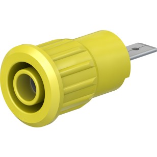 Insulated, rigid, Ø 4 mm, accepting spring-loaded Ø 4 mm plugs with rigid insulating sleeve. Brass sheet. The socket is pressed into pre-drilled panels of plastic, metal, etc.Flat connecting tab 4.8 mm × 0.8 mm, can be bent to 90°, once only.