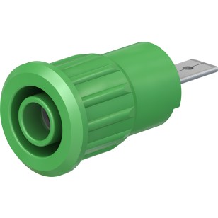 Insulated, rigid, Ø 4 mm, accepting spring-loaded Ø 4 mm plugs with rigid insulating sleeve. Brass sheet. The socket is pressed into pre-drilled panels of plastic, metal, etc.Flat connecting tab 4.8 mm × 0.8 mm, can be bent to 90°, once only.