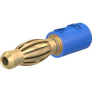 Insulated, Ø 4 mm plug, made of brass, with spring-loaded MULTILAM. Ø 2 mm rigid socket in insulator accepting springloaded Ø 2 mm plugs (pluggable on both sides).