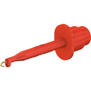 Hook clip made of hard-drawn copper alloy for grasping IC legs, plug pins and bare wire connections. Grasped objects are pressed against the tip of the insulator under spring pressure. The low weight of the clip imposes hardly any load even on critical contacts. Ø 2 mm rigid socket in insulator.