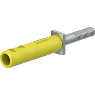 Insulated, with M3.5 external thread for connecting to rail mounted terminals with M3.5 threaded holes. Machined brass. Ø 4 mm rigid socket in insulator accepting spring-loaded Ø 4 mm plugs with rigid insulating sleeve. Socket with internal slot for screwdriver.