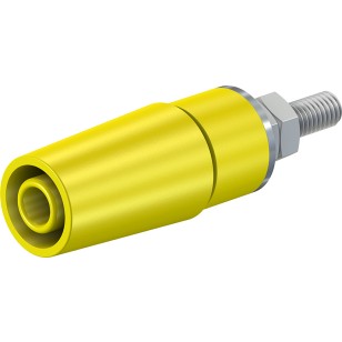 Insulated, rigid, Ø 4 mm, accepting spring-loaded Ø 4 mm plugs with rigid insulating sleeve. Machined brass. The socket is surface-mounted in pre-drilled panels of plastic, metal, etc.Connection: Threaded bolt M4.
