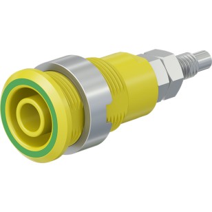 Insulated, rigid, Ø 4 mm, accepting spring-loaded Ø 4 mm plugs with rigid insulating sleeve. Machined brass. The socket is screwed into pre-drilled panels of plastic, metal, etc.Connection: Threaded bolt M4 and soldering hole.