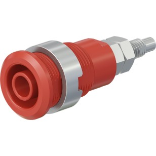 Insulated, rigid, Ø 4 mm, accepting spring-loaded Ø 4 mm plugs with rigid insulating sleeve. Machined brass. The socket is screwed into pre-drilled panels of plastic, metal, etc.Connection: Threaded bolt M4 and soldering hole.