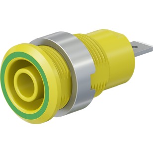 Insulated, rigid, Ø 4 mm, accepting spring-loaded Ø 4 mm plugs with rigid insulating sleeve. Machined brass. The socket is screwed into pre-drilled panels of plastic, metal, etc.Connection: Flat connecting tab 4,8 mm × 0,8 mm.