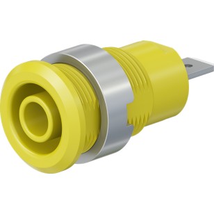 Insulated, rigid, Ø 4 mm, accepting spring-loaded Ø 4 mm plugs with rigid insulating sleeve. Machined brass. The socket is screwed into pre-drilled panels of plastic, metal, etc.Connection: Flat connecting tab 4,8 mm × 0,8 mm.