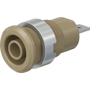 Insulated, rigid, Ø 4 mm, accepting spring-loaded Ø 4 mm plugs with rigid insulating sleeve. Machined brass. The socket is screwed into pre-drilled panels of plastic, metal, etc.Connection: Flat connecting tab 4,8 mm × 0,8 mm.