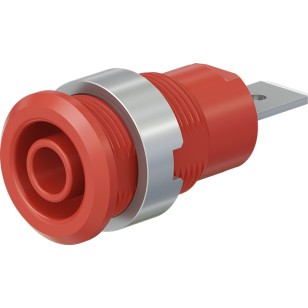 Insulated, rigid, Ø 4 mm, accepting spring-loaded Ø 4 mm plugs with rigid insulating sleeve. Machined brass. The socket is screwed into pre-drilled panels of plastic, metal, etc.Connection: Flat connecting tab 6,3 mm × 0,8 mm.