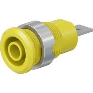 Insulated, rigid, Ø 4 mm, accepting spring-loaded Ø 4 mm plugs with rigid insulating sleeve. Machined brass. The socket is screwed into pre-drilled panels of plastic, metal, etc.Connection: Flat connecting tab 6,3 mm × 0,8 mm.