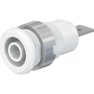 Insulated, rigid, Ø 4 mm, accepting spring-loaded Ø 4 mm plugs with rigid insulating sleeve. Machined brass. The socket is screwed into pre-drilled panels of plastic, metal, etc.Connection: Flat connecting tab 6,3 mm × 0,8 mm.