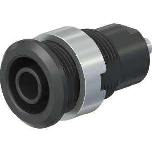 Insulated, rigid, Ø 4 mm, accepting spring-loaded Ø 4 mm plugs with rigid insulating sleeve. Machined brass. The socket is screwed into pre-drilled panels of plastic, metal, etc.Connection: Solder connection
