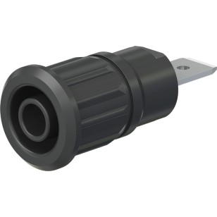 Insulated, rigid, Ø 4 mm, accepting spring-loaded Ø 4 mm plugs with rigid insulating sleeve. Machined brass. The socket is pressed into pre-drilled panels of plastic, metal, etc.Connection: Flat connecting tab 6.3 mm × 0.8 mm.