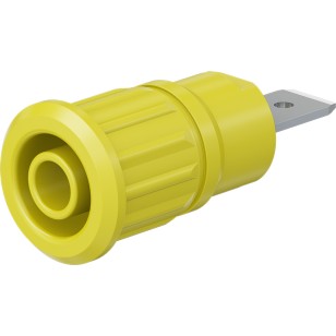 Insulated, rigid, Ø 4 mm, accepting spring-loaded Ø 4 mm plugs with rigid insulating sleeve. Machined brass. The socket is pressed into pre-drilled panels of plastic, metal, etc.Connection: Flat connecting tab 6.3 mm × 0.8 mm.