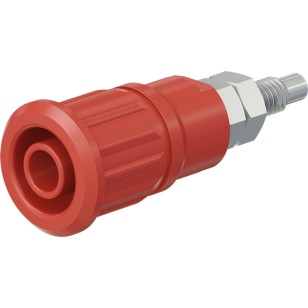 Insulated, rigid, Ø 4 mm, accepting spring-loaded Ø 4 mm plugs with rigid insulating sleeve. Machined brass. The socket is pressed into pre-drilled panels of plastic, metal, etc.Connection: Threaded bolt M4 and soldering hole