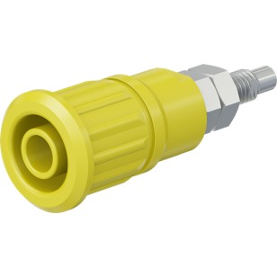Insulated, rigid, Ø 4 mm, accepting spring-loaded Ø 4 mm plugs with rigid insulating sleeve. Machined brass. The socket is pressed into pre-drilled panels of plastic, metal, etc.Connection: Threaded bolt M4 and soldering hole