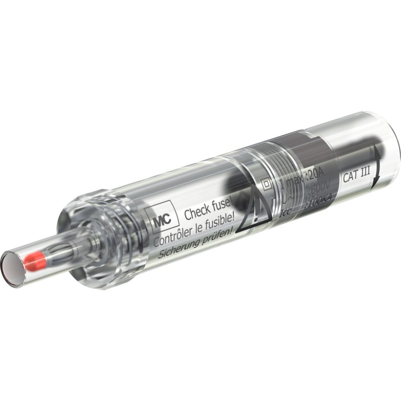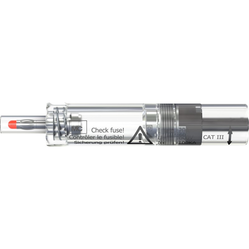 One Ø 4 mm plug with rigid insulating sleeve and one rigid Ø 4 mm socket, to accept spring-loaded Ø 4 mm plugs with rigid insulating sleeve. For voltage measurement and for protection of electrical equipment in high energy low voltage systems. The adapter can be equipped with an efficient low voltage fuse which reliably isolates the circuit from the power grid in the event of excessively high current load. Transparent fuse holder sleeve to accept a high-rating fuse 10 x 38 mm.The fuse is not supplied.
