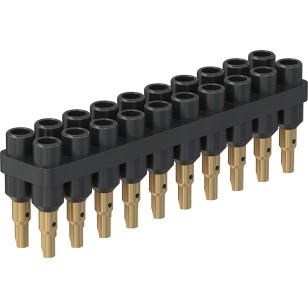 20-pole socket strips, consisting of 2 rows of 10 sockets with solder connection. No need for individual mounting of sockets: Simplified panel drilling, orientation of solder connections and compact mounting with only 5 screws. Available with socket spacing of 12 mm.