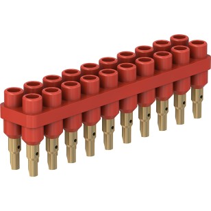 20-pole socket strips, consisting of 2 rows of 10 sockets with solder connection. No need for individual mounting of sockets: Simplified panel drilling, orientation of solder connections and compact mounting with only 5 screws. Available with socket spacing of 12 mm.