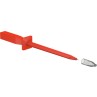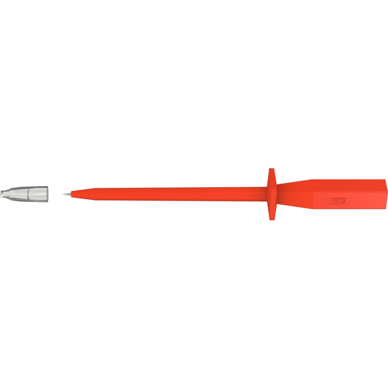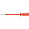 Test probe with stainless steel needle, ground to a sharp point, eg. for piercing thin insulation and oxide layers. The insulation can be cut back in steps to bare a suitable length of tip. The test probe features an anti-roll finger guard. Ø 4 mm rigid socket in handle.Supplied with protective cap.