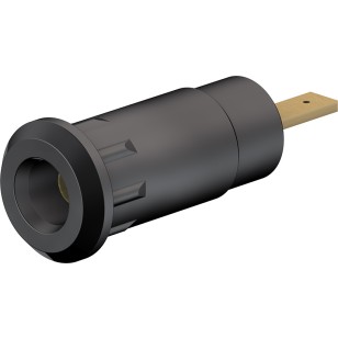 Insulated, rigid, accepting spring-loaded Ø 2 mm plugs with rigid insulating sleeve. The socket is pressed into pre-drilled panels of plastic, metal, etc.Connection: Flat connecting tab 2.8 mm x 0.8 mm.