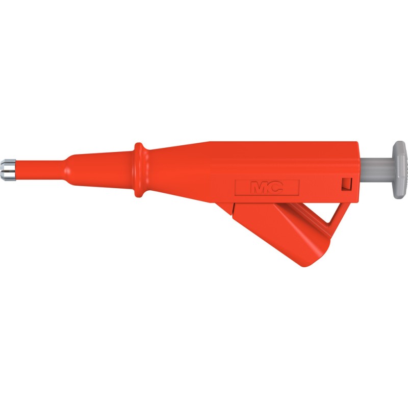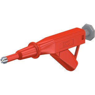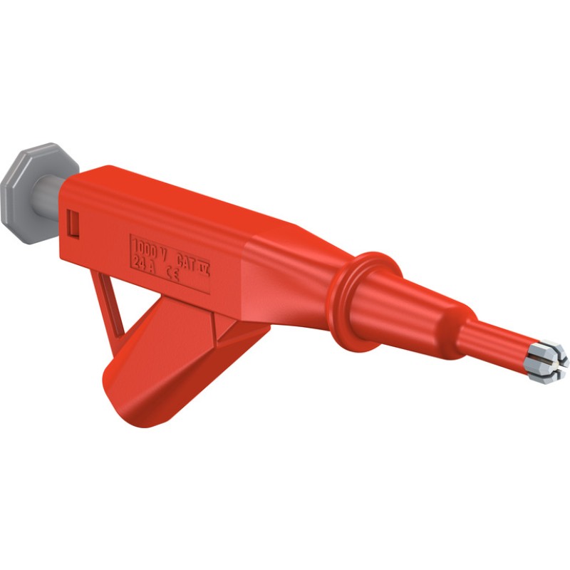 For fast, safe connection to screws/bolts with internal hexagon. Twisting the button on the back of the handle spreads the hexagonal tip so that the adapter fits firmly into internal hexagons with 5 mm wrench size. This results in multiple contact points that enable low contact resistance. The adapter can also be operated by hand when under load. The fixed Ø 4 mm socket in insulator is suitable for fitting spring-loaded Ø 4 mm plugs with rigid insulating sleeve.Design: 5 mm with gray button