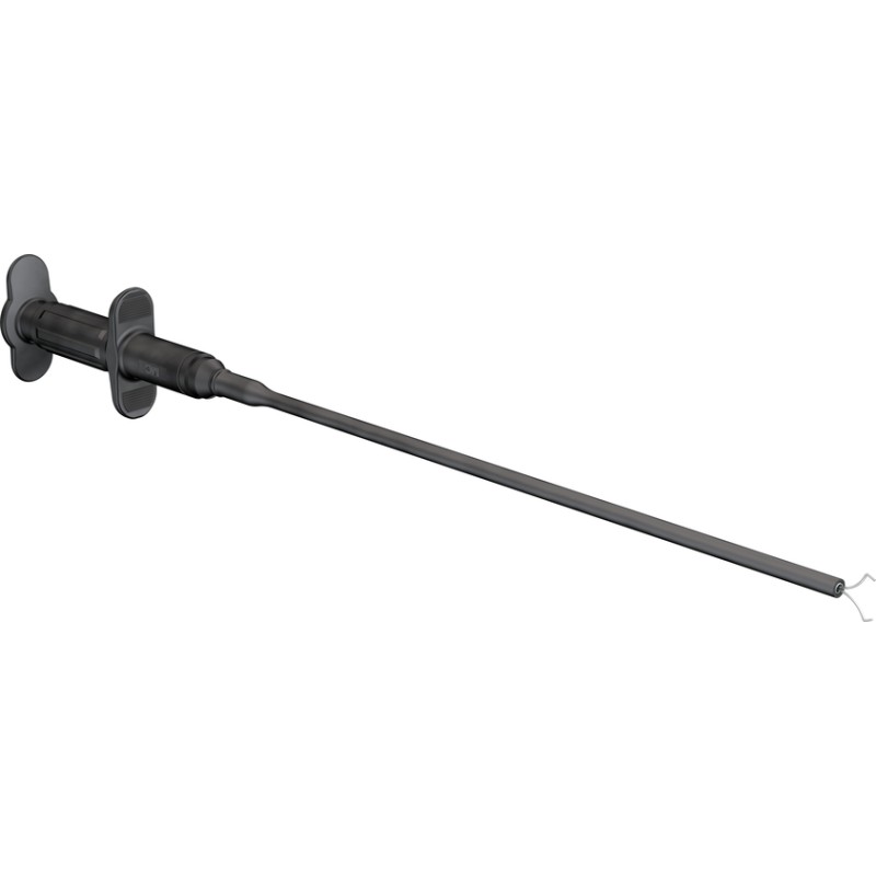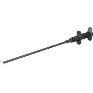 With flexible shaft and spring wire grabber (stainless steel) for a good contact to pins and wires in inaccessible places. Especially suitable for measuring voltages. The shaft is silicone insulated and guarantees good heat resistance and flexibility even at low temperatures. Ø 4 mm rigid socket in handle accepting spring-loaded Ø 4 mm plugs with rigid insulating sleeve.Version with different shaft lengths is available.