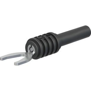 Made of brass for permanent installation, e.g. for connecting screw terminals. Ø 4 mm rigid socket in insulator accepting spring-loaded Ø 4 mm plugs with rigid insulating sleeve.Fork lug can be bent once to 45°.