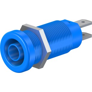 Insulated, rigid, Ø 4 mm, accepting spring-loaded Ø 4 mm plugs with rigid insulating sleeve. Brass sheet. The socket consists of two insulated, semi-circular contacts, which are connected to each other when a plug is inserted (switch function). The socket is screwed into pre-drilled panels of plastic, metal, etc.Connection: 2x Flat connecting tab 4.8 mm × 0.8 mm.