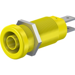 Insulated, rigid, Ø 4 mm, accepting spring-loaded Ø 4 mm plugs with rigid insulating sleeve. Brass sheet. The socket consists of two insulated, semi-circular contacts, which are connected to each other when a plug is inserted (switch function). The socket is screwed into pre-drilled panels of plastic, metal, etc.Connection: 2x Flat connecting tab 4.8 mm × 0.8 mm.
