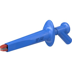 With steel jaws especially for connections to ground rails and thick cables. For increased safety when making contacts, the jaws are insulated on the outside. Ø 4 mm rigid socket in handle accepting spring-loaded Ø 4 mm plugs with rigid insulating sleeve.